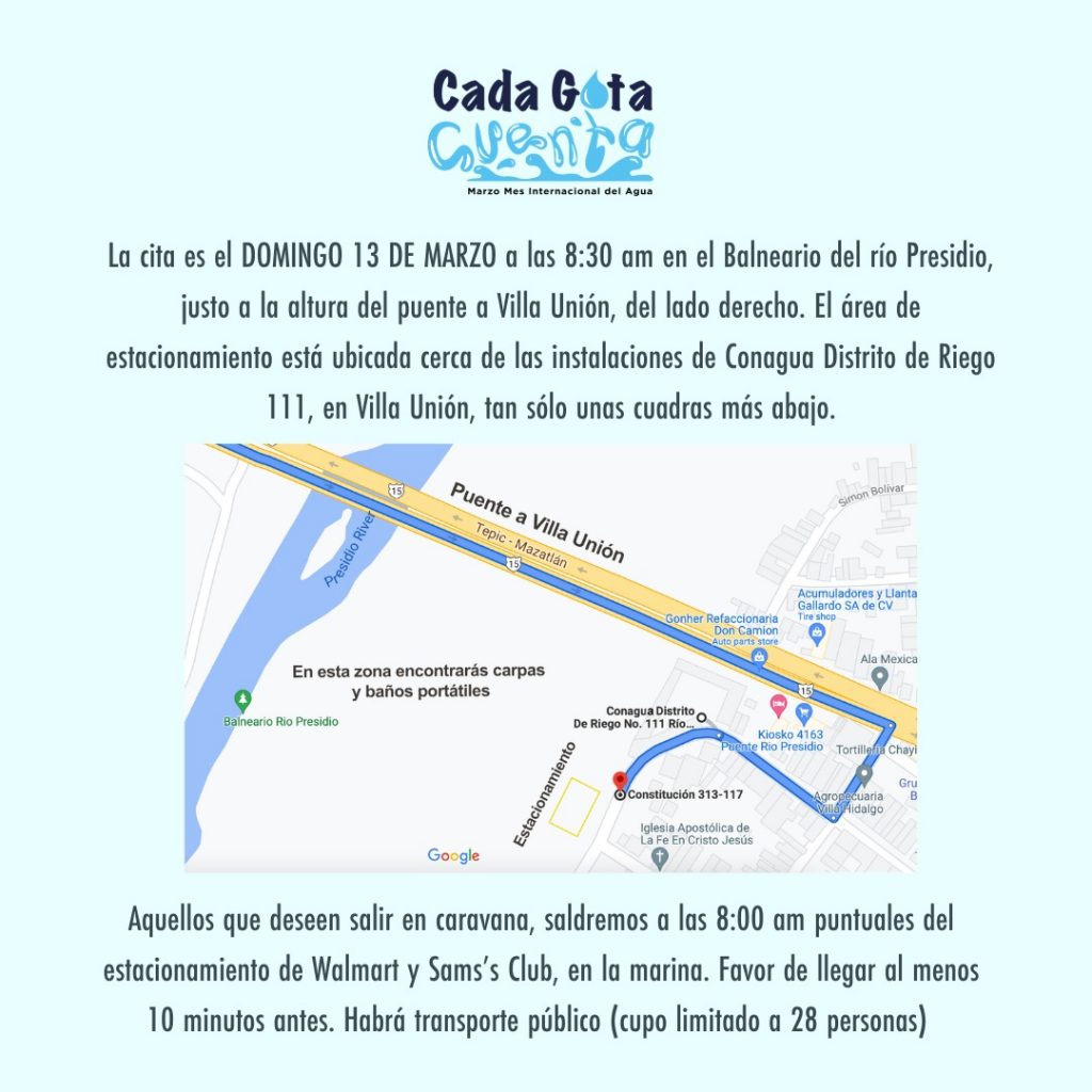 La cita es el próximo domingo 13 de marzo de 8:30 a 12:00 horas, en el balneario del río Presidio, justo a la altura del puente de Villa Unión, el estacionamiento será en las instalaciones de la Conagua, pero si no tienes vehículo, la asociación pone a tu disposición una unidad que saldrá a las 8:00 horas del estacionamiento de Walmart y Sam’s Club La Marina.