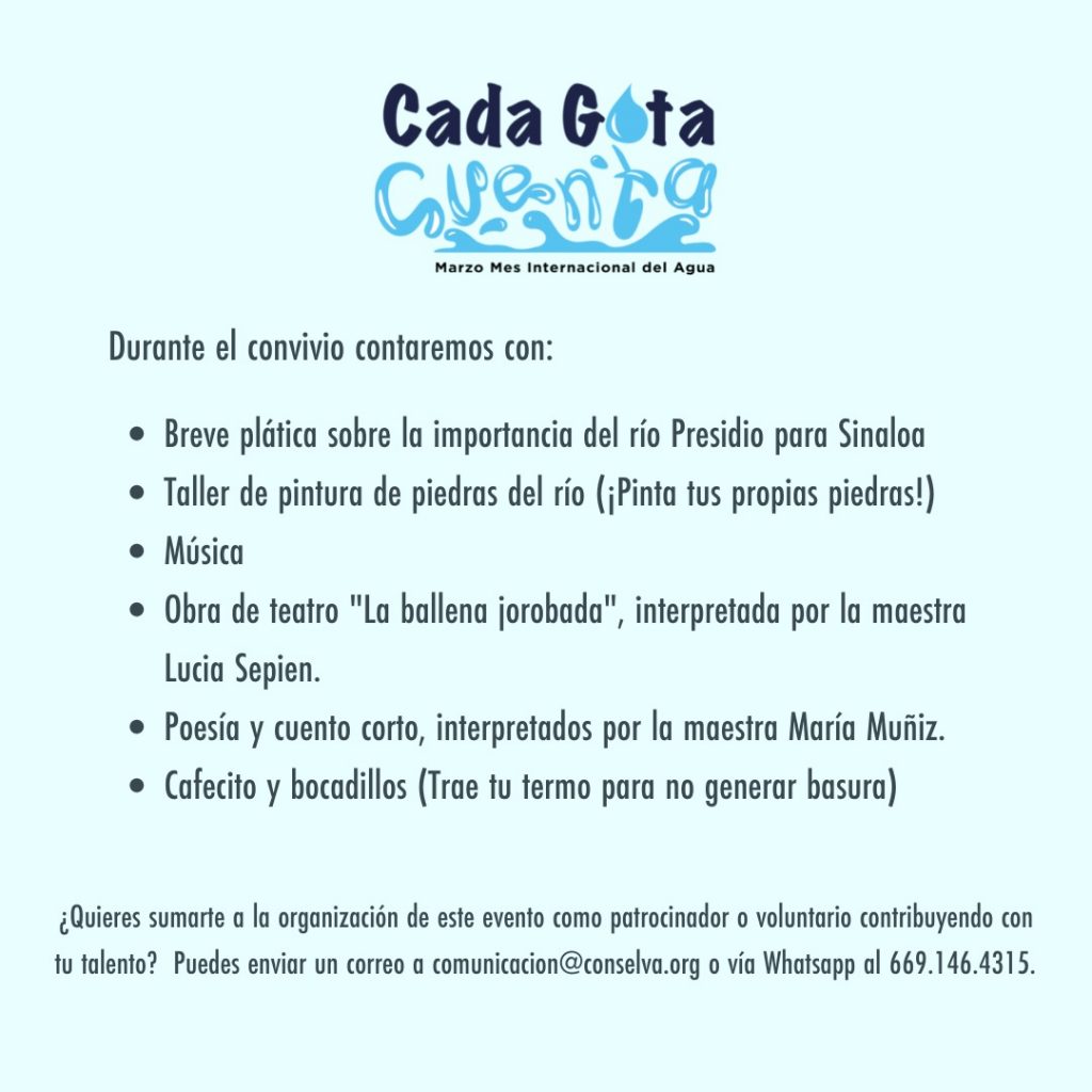 Durante el picnic, tendrán una breve charla sobre la importancia del río Presidio para Sinaloa, un taller de pintura de piedras del río, habrá música, una obra de teatro llamada “La ballena jorobada”, interpretada por Lucía Sapien.