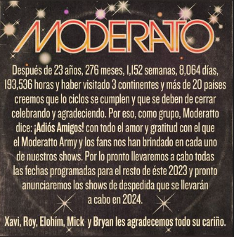 «Creemos que lo ciclos se cumplen y que se deben de cerrar celebrando y agradeciendo. Por eso, como grupo, Moderatto dice: ¡Adiós Amigos! con todo el amor y gratitud con el que el Moderatto Army y los fans nos han brindado en cada uno de nuestros shows. Por lo pronto llevaremos a cabo todas las fechas programadas para el resto de éste 2023 y pronto anunciaremos los shows de despedida que se llevarán a