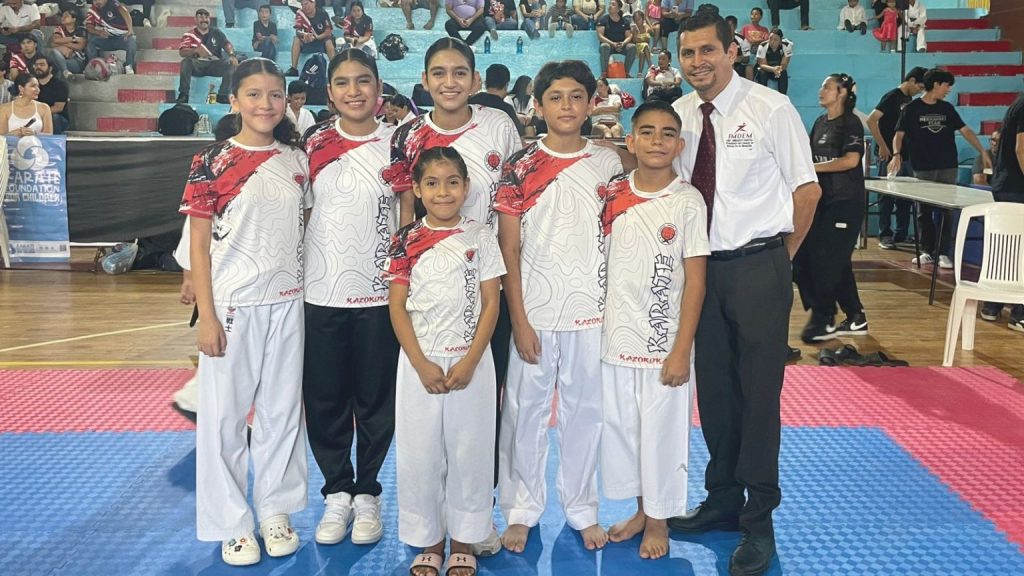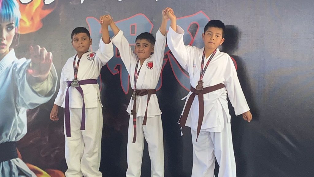 Entre los más destacados figuró Alan Aguiar Gómez, quien se colgó dos oros en kata y kumite (cintas cafés, 8-9 años). Su hermana Alany Aguiar también brilló con oro en kata y plata en kumite (cintas negras, 11-12 años).