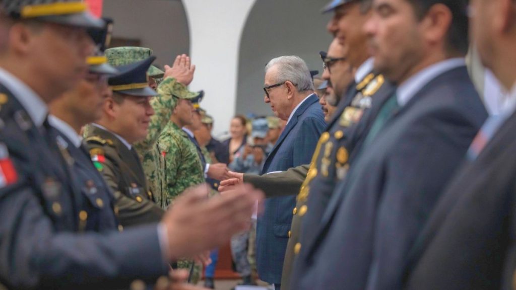 Además de la entrega de ascensos a personal del Ejército Mexicano, Fuerza Aérea y Guardia Nacional, en el desfile participaron elementos militares, corporaciones policiales y de auxilio, y sociedad civil.