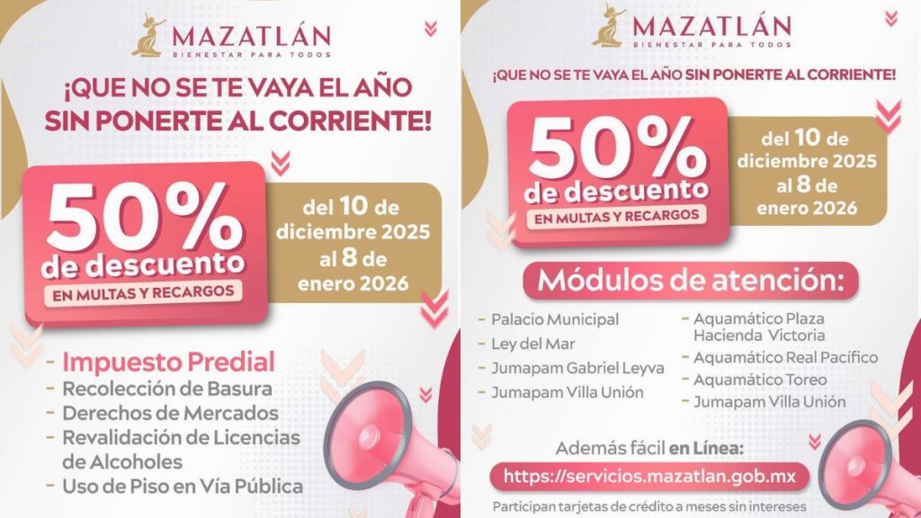 MAZATLÁN. – Que no se te pasen los descuentos, en Mazatlán hay campaña del 50 por ciento en multas y recargos del Predial, la idea es apoyar la economía de las familias y regularizar sus pagos en impuestos municipales.