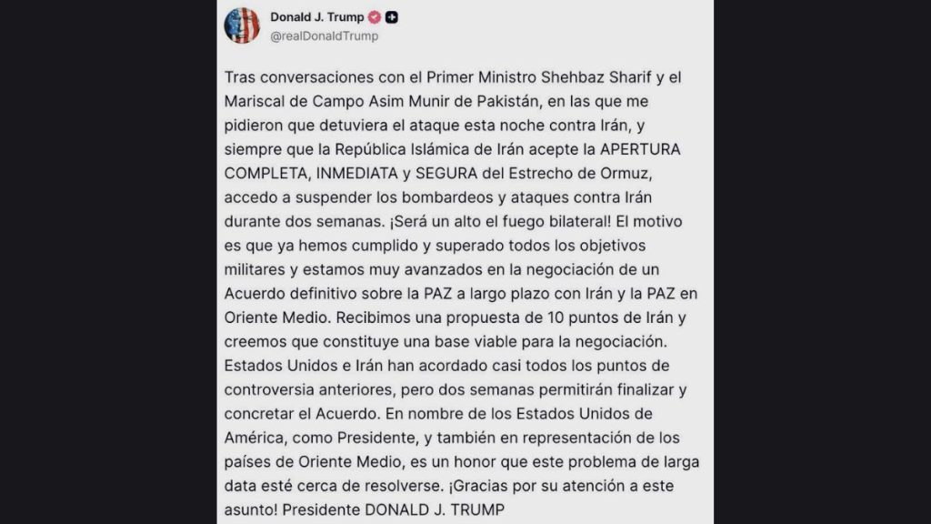 Trump aseguró que se trata de un alto el fuego bilateral y sostuvo que Estados Unidos ya cumplió sus objetivos militares, además de estar cerca de un acuerdo de paz duradero. También mencionó una supuesta propuesta de 10 puntos enviada por Teherán como base para negociar.